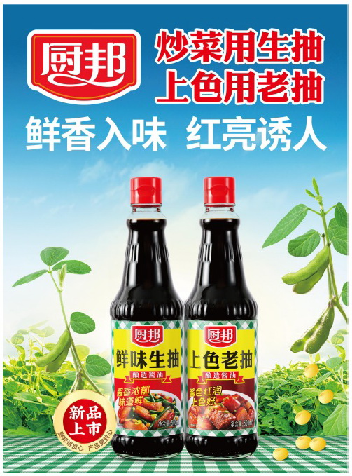 厨邦鲜味生抽、厨邦上色老抽使用精选非转基因东北大豆为原料,传承南派酱油传统酿造工艺精髓,打造“晒足180 天”的鲜美味道。厨邦鲜味生抽色泽清亮、酱香浓郁、味道鲜,适用于炒菜、点蘸、凉拌、清蒸等多用烹饪,令菜肴鲜香入味;厨邦上色老抽色泽红润、酱香浓郁、上色好,适用于红烧、炒菜、焖炖、酱卤等多种烹饪方式,使得菜色红亮诱人,激发食欲。两款产品完美地满足了广大家庭、餐饮厨师对鲜味和上色的多种需求,为广大消费者带来无限的美味体验。