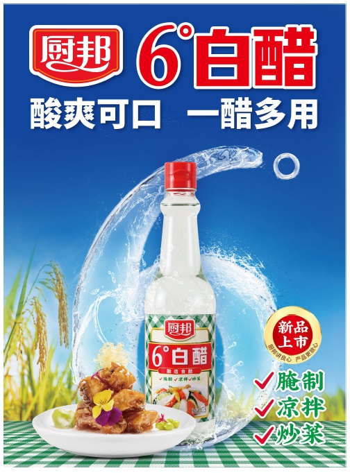 厨邦6°白醋严格选用好品质原料,采取液态发酵工艺精制而成。色泽澄清,口感酸爽绵长,恰到好处的6°令菜肴的成品风味更佳。产品外观形象以清新自然的浅黄色调为主,搭配色泽诱人、富有食欲的醋泡萝卜菜品图,适合于腌制、凉拌、炒菜、生活日用等多种用途。在烹饪中不仅能起到调和滋味、增加香味、祛除异味的作用,还能减少食材中维生素C 的损失,促进食材中钙、磷、铁等成分的溶解,提高菜肴营养价值和人体吸收利用率。名副其实一醋多用,是家中常备的调味品。