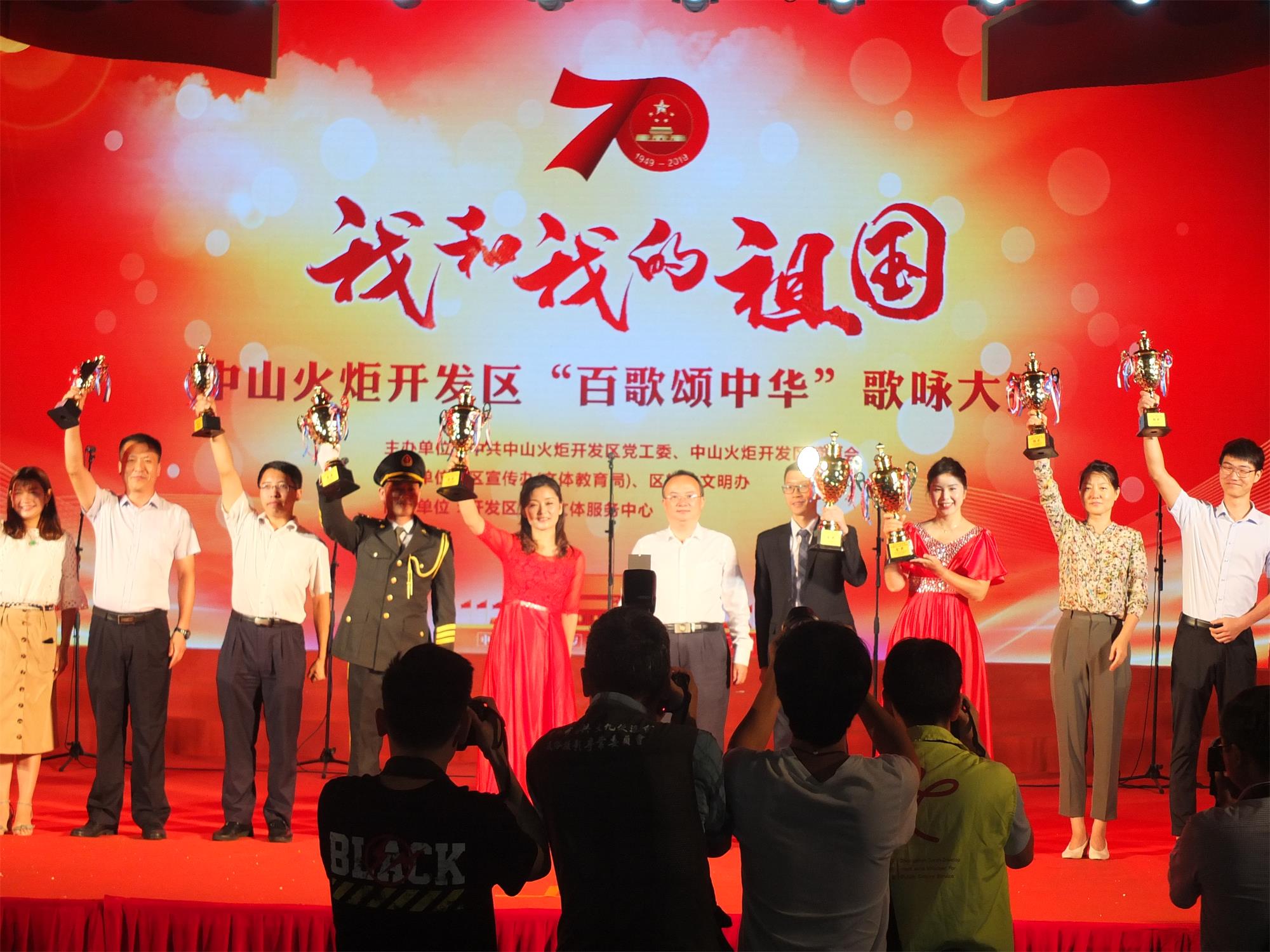 10月15日,为庆祝中华人民共和国成立70周年,由中山火炬开发区党工委、管委会主办,区宣传办(文体教育局)、区精神文明办承办,区宣传文体服务中心协办的《我和我的祖国 中山火炬开发区“百歌颂中华”歌咏大赛》在区体育活动中心举行。比赛分事业单位、企业公司组与学校组两个组别进行,共有24支队伍参赛,每个组别决出金奖、银奖、铜奖各四名。