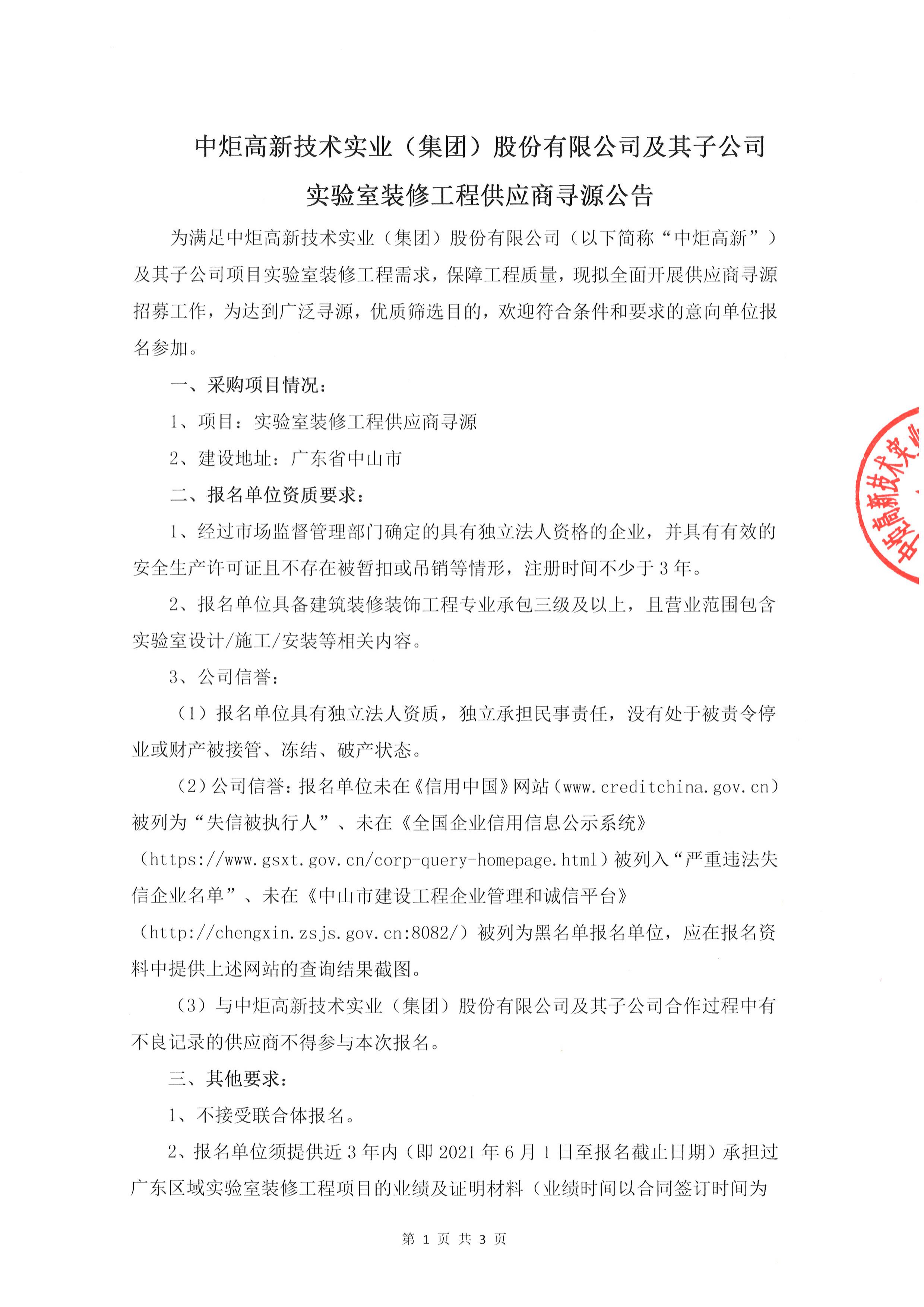 ag亚娱高新技术实业(集团)股份有限公司实验室装修工程供应商寻源公告