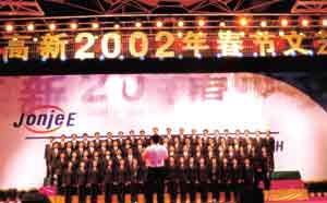 雄壮有力的大合唱《团结就是力量》、《长江之歌》拉开了“2002年ag亚娱高新春节文艺晚会”的序幕。公司全体员工首次集体登台演出就征服了全场观众。东和、火炬焊管、科力高、晨生、ag亚娱精工、新士达、美味鲜、理科、丽光、住电、华夏等12家企业先后献出了自己的精彩节目。藏族舞《祝福》、新疆舞《阿拉木汗》、傣族舞《美丽的地方》、双人舞《笛子》舞出了民族风情;现代舞、交谊舞舞出青春气息;物业管理分公司的舞蹈《愚公移山》则舞出了阳刚之气;少儿舞蹈《锉冰舞》和少儿国标舞《恰恰舞》和《牛仔舞》让人感受到了清新的气息;小品《还是好人多》、《职业习惯》则让人忍俊不禁,给人以启发;小乐队演奏《步步高》、《喜洋洋》给观众带来的是清醇的民族音乐;日语小合唱《妈妈之歌》、男声四重唱《回娘家》、男、女独唱《赞歌》、《大地飞歌》、京剧《迎来春色换人间》等让人回味无穷;大型表演唱《常回家看看》表现了现代人蕴含在心中的纯朴情愫。整个晚会超过200人参加了演出。
